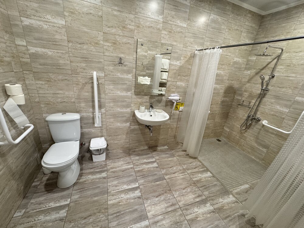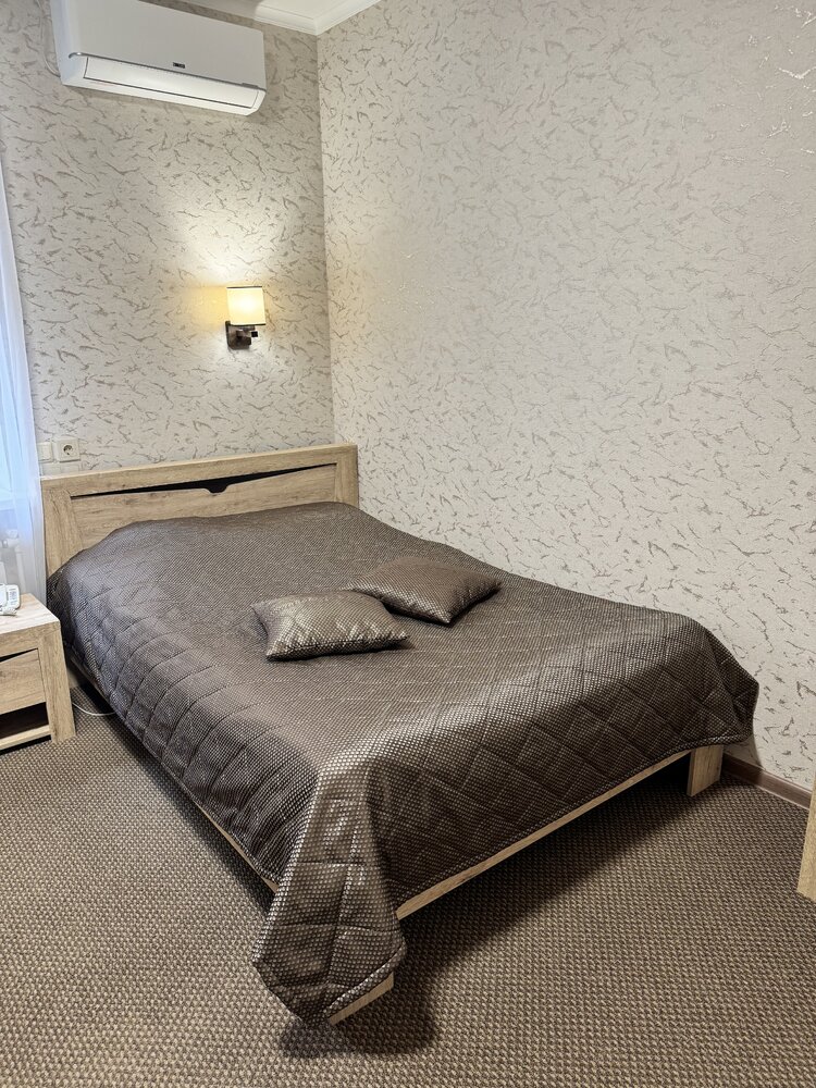 В номере: двуспальная кровать, прикроватные тумбы, туалетный столик, пуф, обеденный стол, стулья, шкаф для одежды, прихожая, кухонный уголок, раковина, телевизор, телефон, холодильник, кондиционер.
